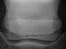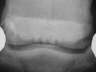 Bei diesem Beispiel liegt eine große Zahl zum Teil schlecht abgegrenzter , zum Teil kolbiger Kanäle vor. Die Kontur des Strahlbeines ist unregelmäßig und konkav mit Doppellinie. In der linken Hälfte ist die Knochenstruktur weniger dicht (A). Dies sind eigentlich Veränderungen der Kategorie III in ihrer Summe aber bis Kategorie IV bzw. Grad 3.