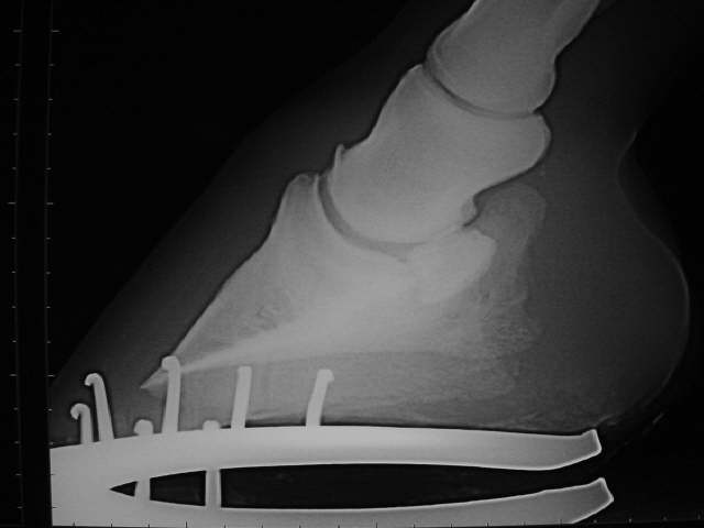 Hufknorpelverknöcherung von der Seite gesehen (Der Flügel, der das Strahlbein überlagert)