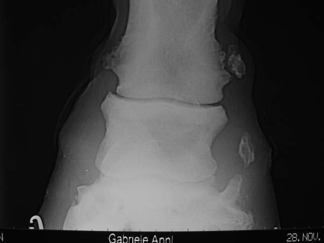 Isolierte Verknöcherung im Hufknorpel rechts und hochgradige Krongelenksarthrose mit Mineralisation