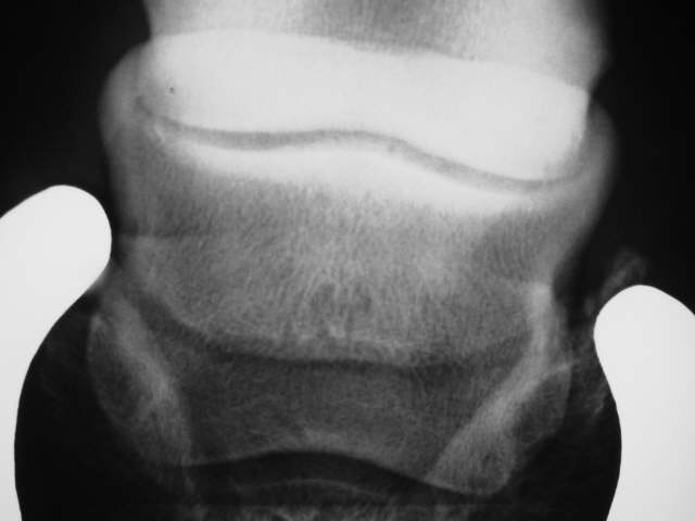 Auflösungserscheinungen am unteren Rand und im Zentrum des Strahlbeines. Röntgenklasse IV