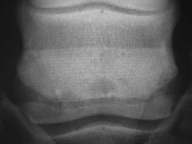 Große noch relativ unscharf abgegrenzte Auflösungserscheinung in der unteren Hälfter des Strahlbeines. Röntgenklasse IV