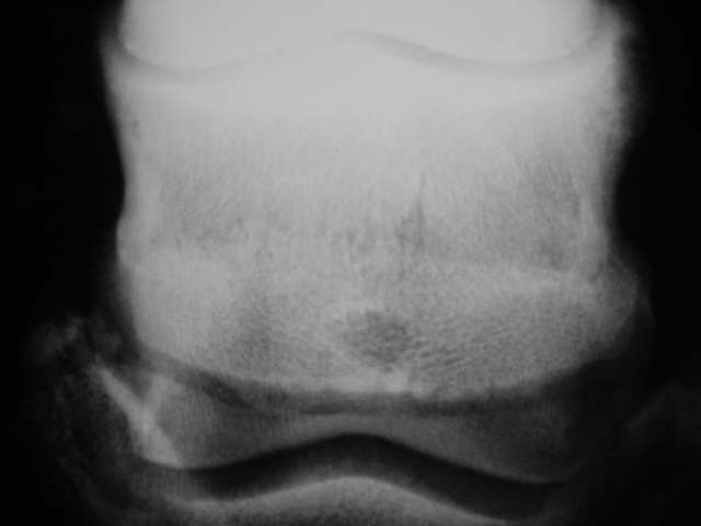 Deutliche zentrale Auflösungserscheinung im Strahlbein mit variierender Knochendichte, Zubildungen am oberen und unteren Rand. Röntgenklasse IV