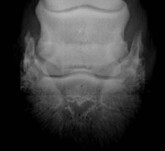 Sklerosierung und deutliche Zubildungen am unteren Rand des Strahlbeines. Röntgenklasse IV