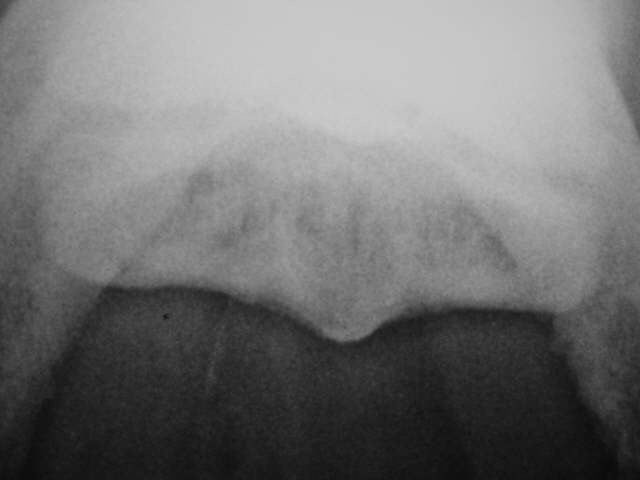 Schlechte Abgrenzung de Knochenschale gegenüber dem Markraum, Verlust der normalen Knochenstruktur mit Sklerosierung und Zystenbildung, unebene Gleitfläche. Röntgenklasse IV