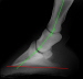 Ein weiteres Beispiel für einen zerstörten Stoßdämpfer. Gebrochene Zehenachse, negativer Hufbeinwinkel, Sklerosierung des Strahlbeines, entsprechend diffuse Anreicherungen in der Strahlbeinregion, dem Hufbein und dem Hufgelenk.