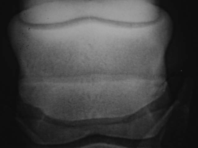Deutlich asymetrisches Strahlbein, die Verschattung am rechten Flügel des Strahlbeines dürfte ein Artefakt vom Strahl sein