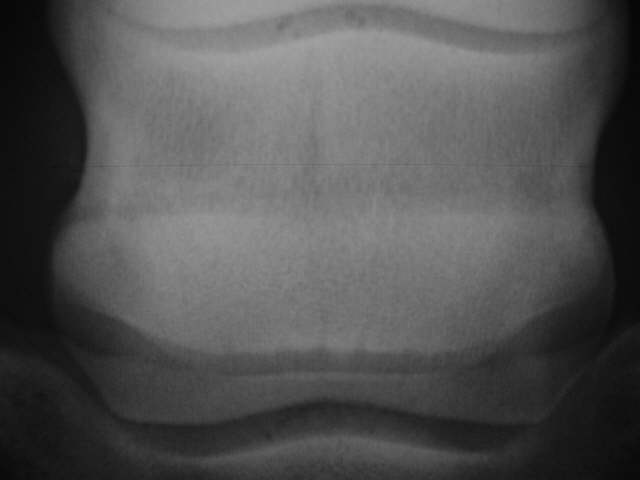 Strahlbein mit gerader oberer Kontur und 2 sehr kleinen Gefäßkanälen.