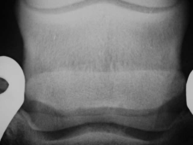 Strahlbein ohne deutliche Gefäßkanäle. Die Knochenstruktur ist unauffällig aber das Strahlbein ist sehr schmal und zeigt eine deutliche doppelte konvexe Kontur am oberen Rand. Am unteren Rand scheint sich links eine Zubildung zu entwickeln. Dieses Strahlbein ist verdächtig, auch wenn es von der Klassifizierung nicht schlecht eingestuft wird.