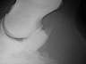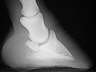 Abgesehen von der Hufgelenksarthrose (A) liegt hier eine isolierte Verkalkung im Bereich des oberen Strahlbeinbandes (v) vor, die Gleitfläche für die tiefe Beugesehne (g) ist unruhig, der Markraum ist verdichtet (sklerosiert - s). Kategorie IV bzw. Grad 4.
