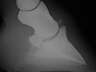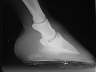 Bei diesem Pferd ist die Zehenachse gebrochen, die Trachten sind flach, das Hufbein ist in der Hornkapsel abgesunken bei leicht negativem Hufbein-Bodenwinkel, die Pfeile zeigen den veränderten Insertionsbereich von unterem Strahlbeinband und tiefer Beugesehne an. Der Stoßdämpfer dieses Pferdes ist zerstört.