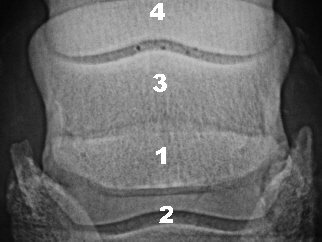 1 Strahlbein, 2 Hufbein, 3 Kronbein, 4 Fesselbein