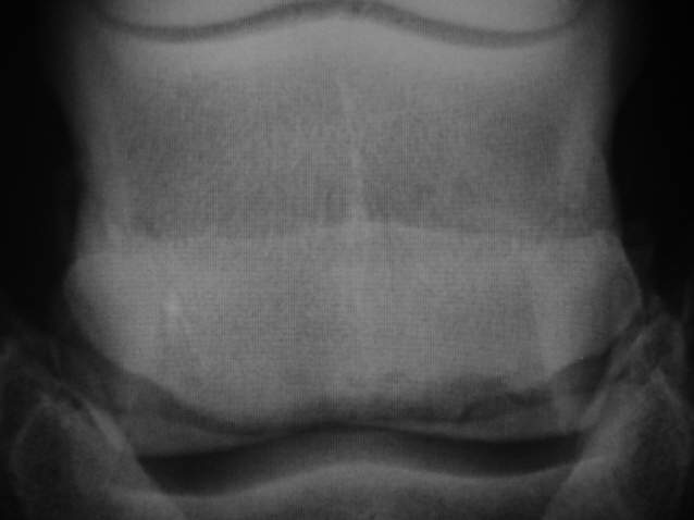 Randfraktur am rechten unteren Rand des Strahlbeines unterhalb der Knochenauflösungszone